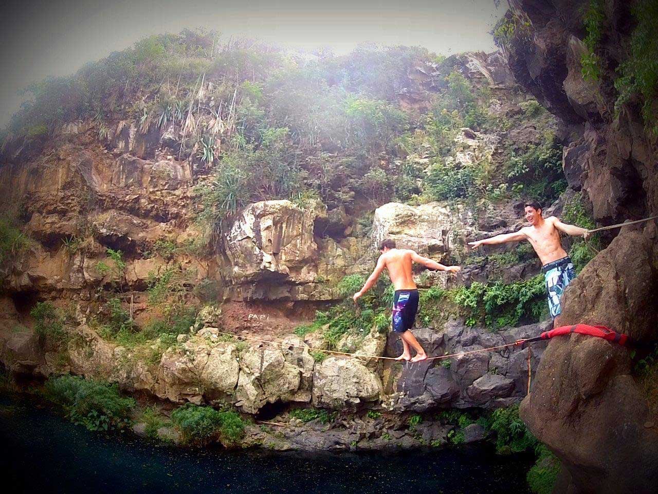 Côté RG : Se rendre au saut de 7m depuis la RG à travers la grotte. Aller au bout de la plateforme et encercler le pic qui fait face à l’ancrage de la RD.
